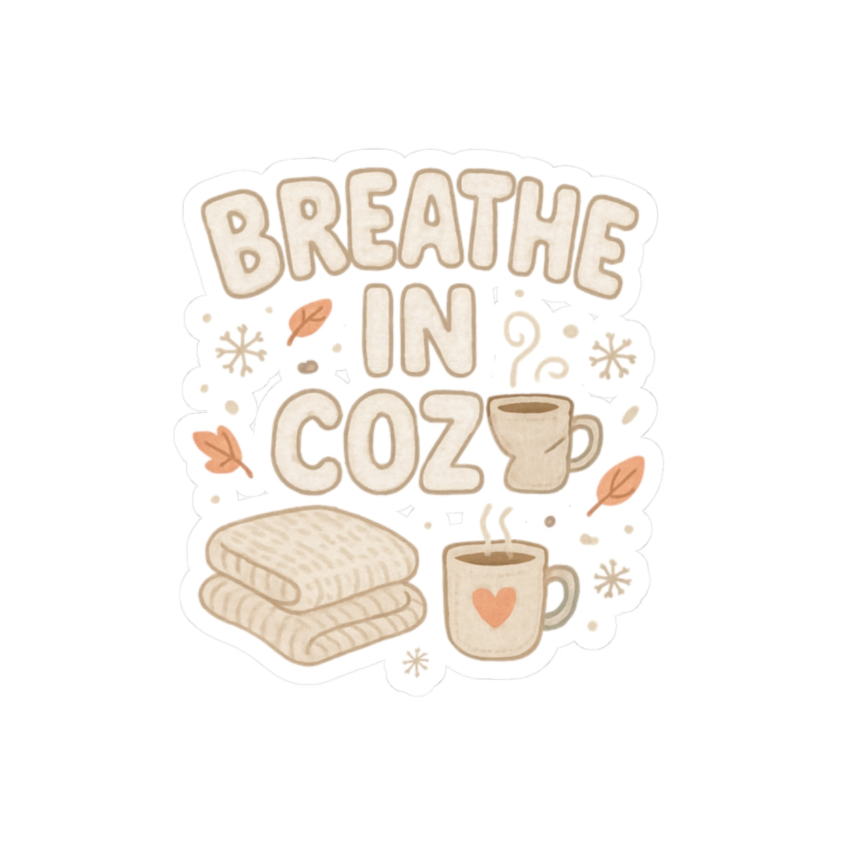 Soft, warm, and quietly cheerful — this glossy kiss-cut sticker brings a moment of calm to your everyday things. Illustrated in gentle beige and latte tones, the design reads “BREATHE IN COZY” surrounded by a steaming mug, a folded blanket, and fluttering leaves. It sticks smoothly to laptops, journals, water-resistant cases, and other flat surfaces to add a little hygge-inspired comfort to your workspace or planner. The vibrant eco-solvent inks keep colors bright while the scratch-resistant finish preserves the cozy details through daily use. Product features - Glossy scratch-resistant finish for lasting detail - Durable 100% vinyl with permanent acrylic adhesive - Printed with bright, eco-solvent inks for vivid colors - Quick, bubble-free application; available in white or transparent - Comes in 4 sizes; PNG kiss-cut format required Care instructions - Use a soft, clean and dry cloth to gently brush any dust or dirt off from the center of the sticker outwards.